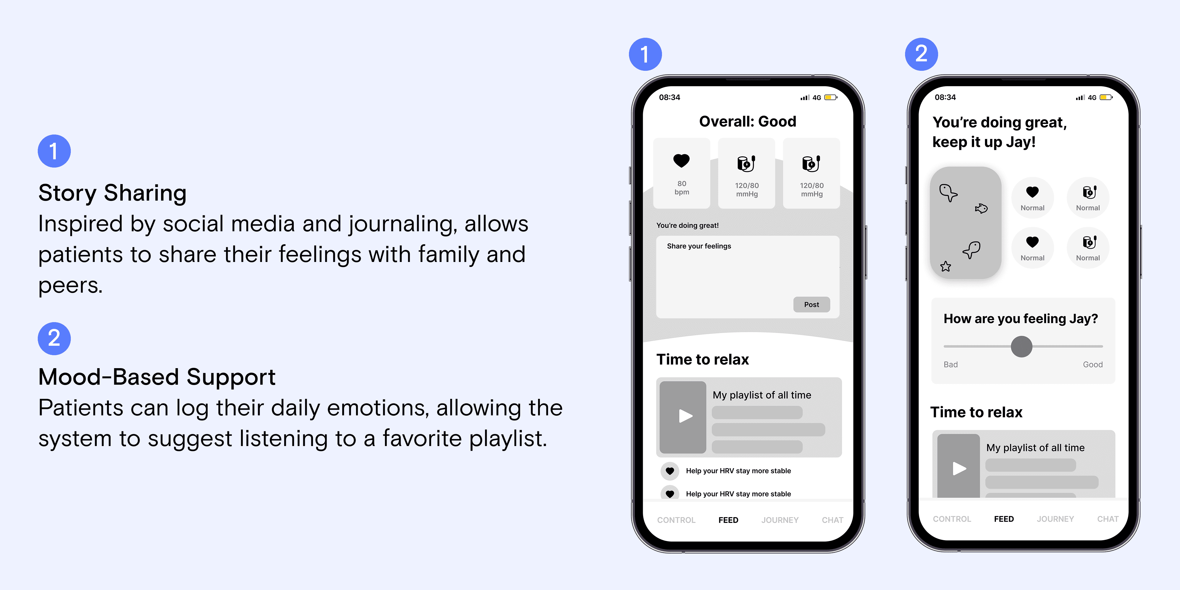 Motivation is essential in a patient’s treatment journey. Although we initially tested frequent rewards, user feedback showed that excessive reinforcement felt insincere and reduced its impact. Based on these insights, I made the design decision to shift toward more meaningful support by creating story-sharing features and mood-based personalized guidance.