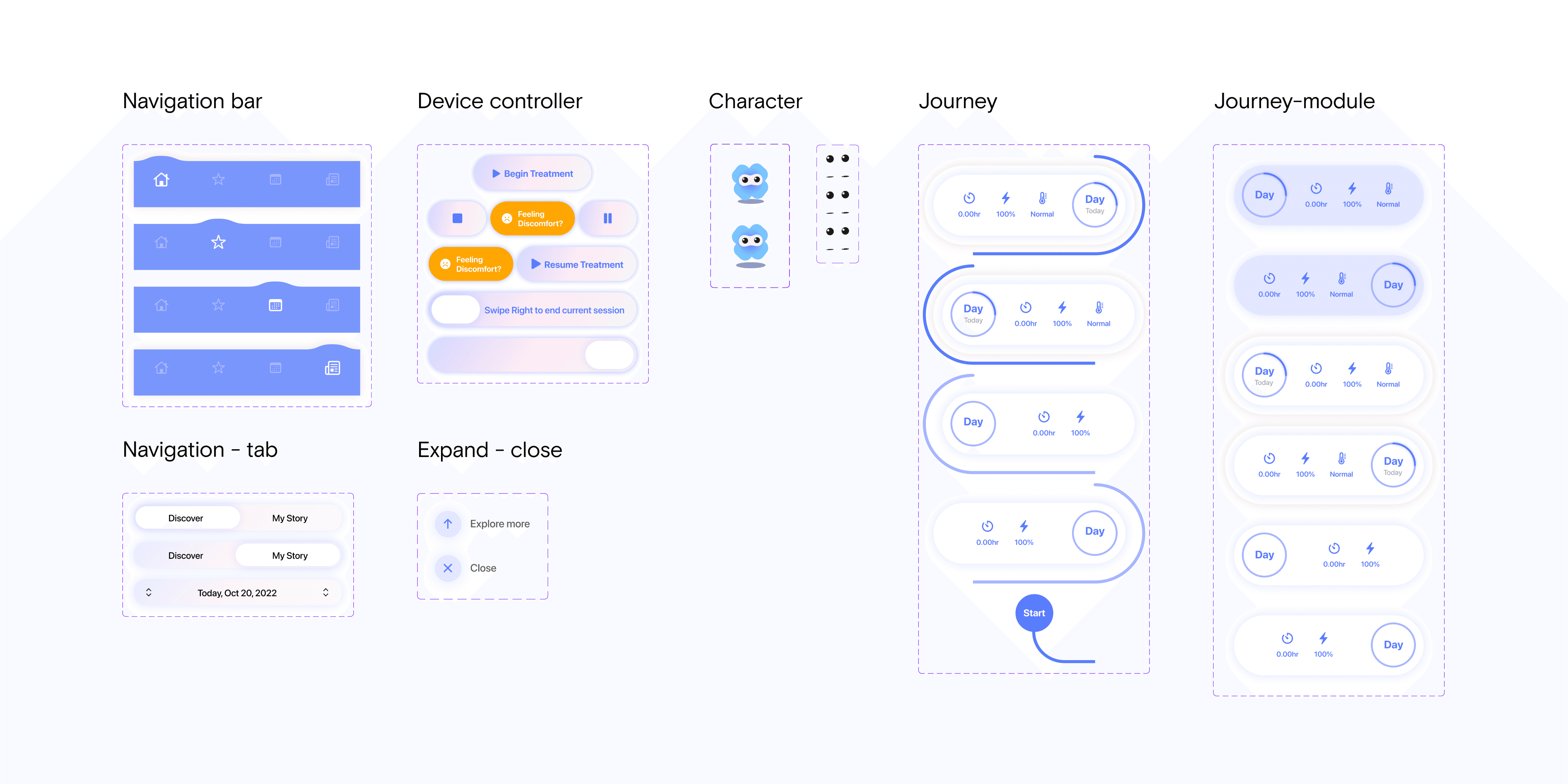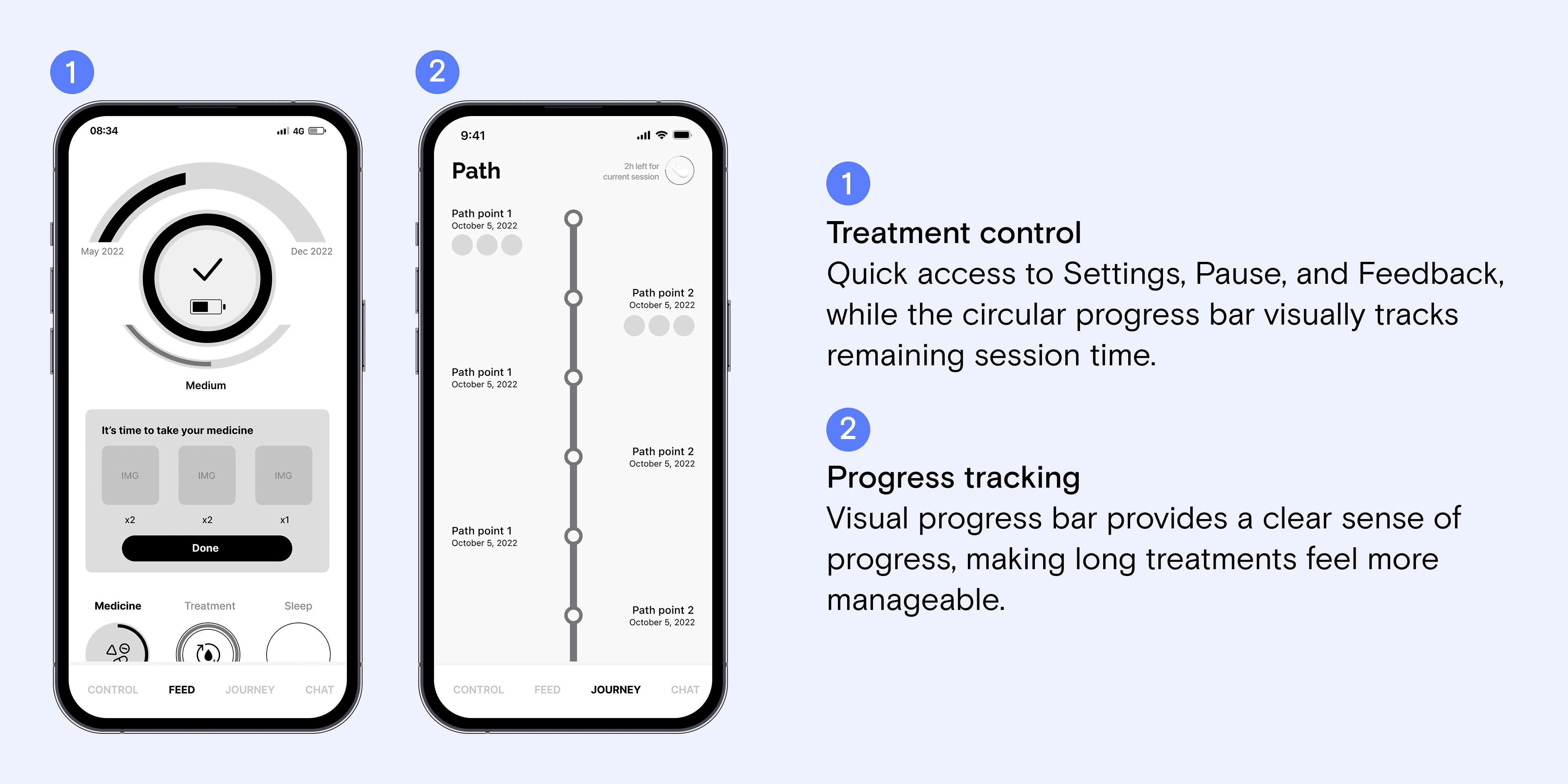When designing for patient engagement, it’s crucial to strike a balance between empowerment and simplicity. Early insights showed that patients wanted more control but felt overwhelmed by too many options. I simplified the experience by designing quick treatment controls, a clear progress ring, and a visual journey that breaks long treatments into manageable steps, making the process feel tangible and encouraging.